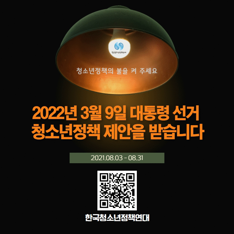 대통령 선거 정책제안 접수 안내 (2021. 8. 3) 안녕하세요. 한국청소년정책연대입니다.2022년 3월 9일 대통령 선거를 앞두고 이제는 청소년정...