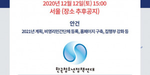 「한국청소년정책연대 정기총회」안내 (2020.11.2)안녕하세요. 회원 여러분.한국청소년정책연대 한 해를 마무리하고 힘찬 2021년을 계획하기 위해 정...