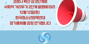 안녕하세요. 공동대표단입니다.사회적 거리두기 2단계 발령뿐 아니라 확진자가 확산되고 있는 시점이라12월 12일(토) 한국청소년정책연대 정기총회는 잠정 연...